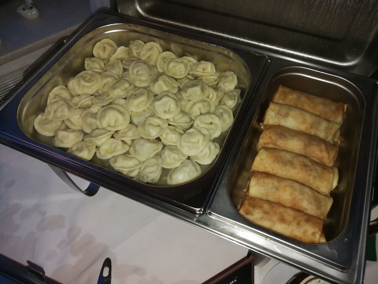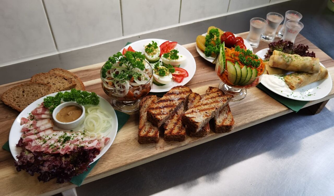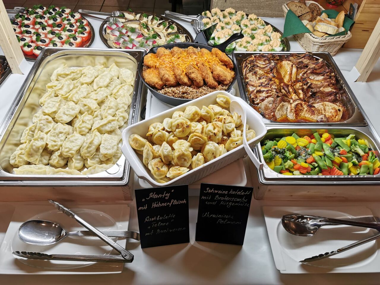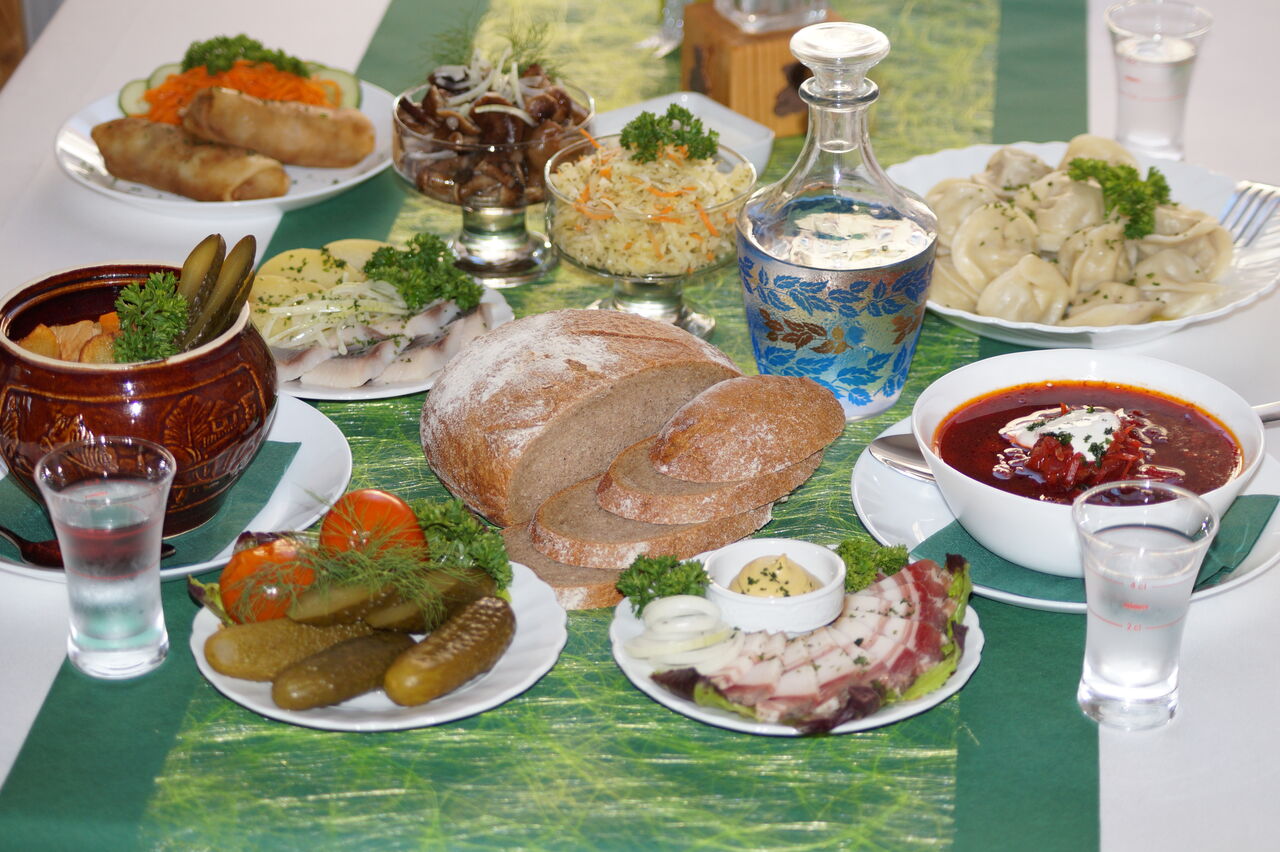 "Russischer Tisch" Man findet sehr viele Gerichte aus Teig, Fleisch und Eingelegtes, Süß als auch Herzhaft wieder.
