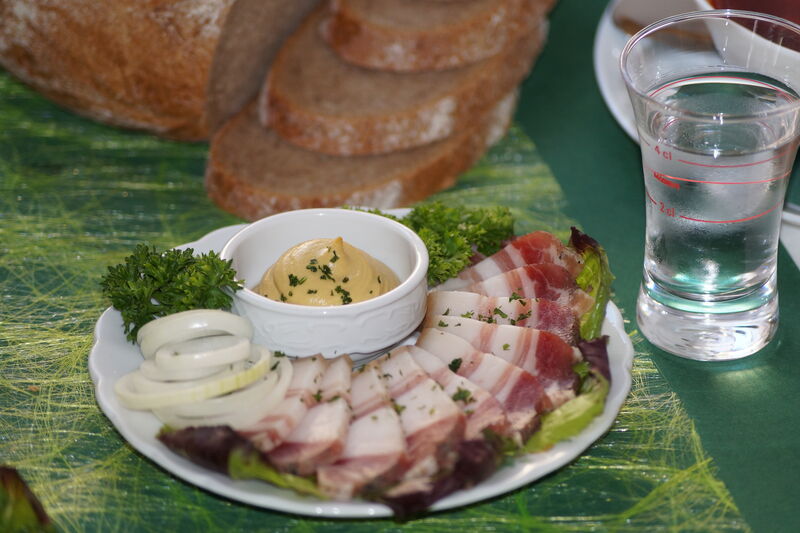 "Salo“ gesalzener Speck serviert mit Zwiebel und Opas Senf.