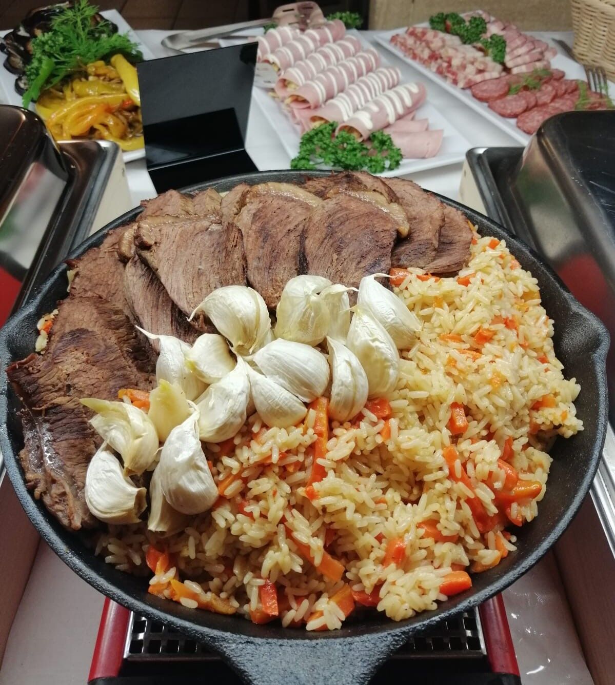 "PLOV" ist ein ursprünglich orientalisches Reisgericht. Zubereitet mit Reis, Zwiebeln, Möhre und Fleisch Nur auf Vorbestellung.