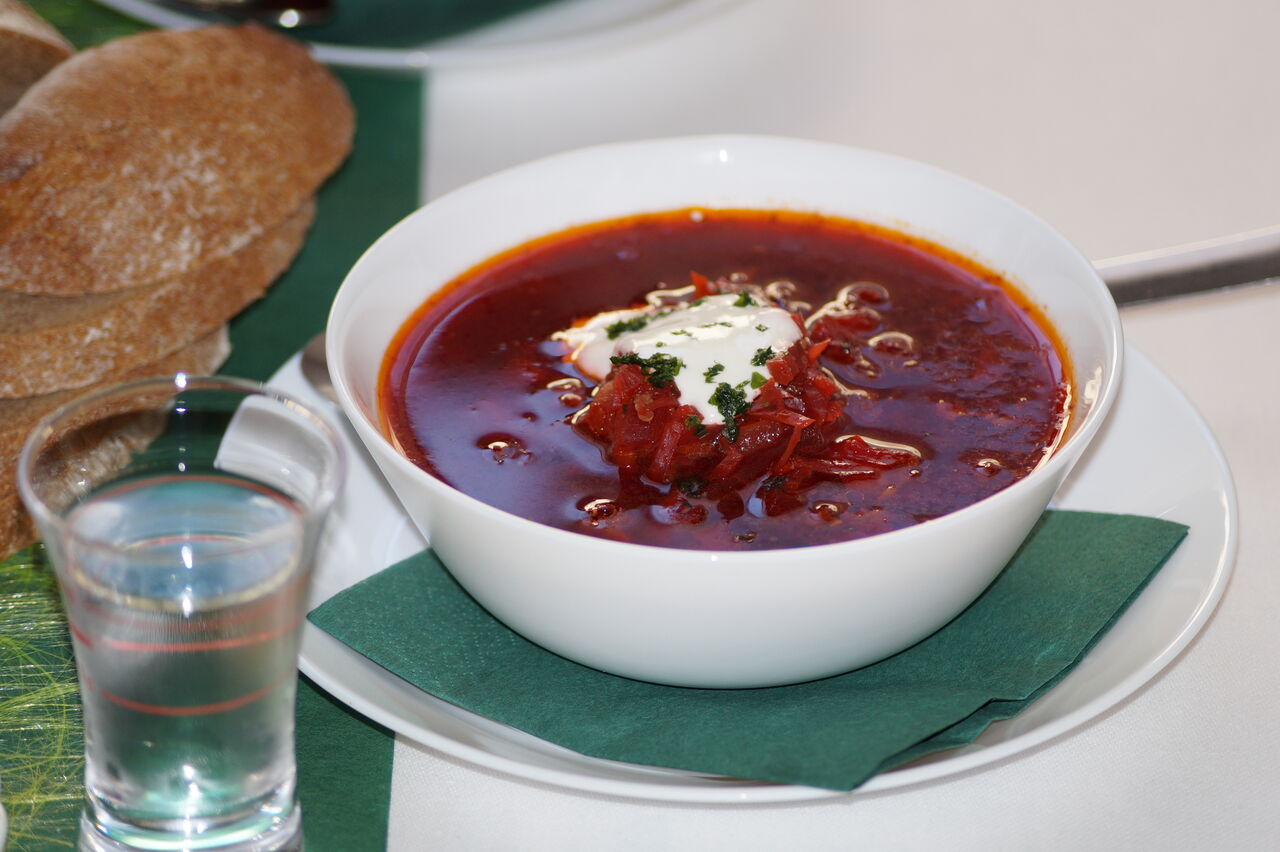 "Borschtsch" ist eine Suppe, die traditionell mit Roter Bete und Weißkohl zubereitet wird.